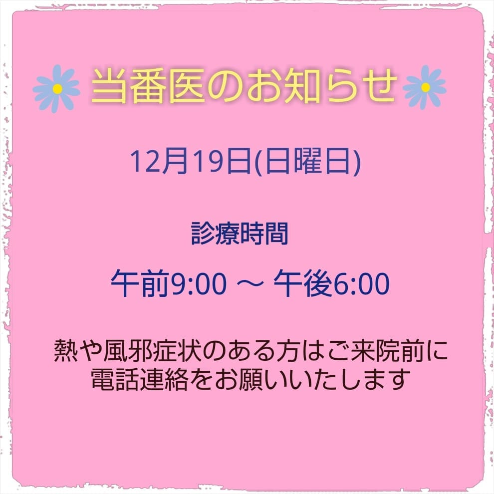 おはようございます。はやかわ循環器内科クリニックです。12月19日(日曜日)は休日当番医のため午前9:00~午後6:00まで診療をおこなっております。保険証をご持参のうえご来院ください。また感染症対策として風邪症状や発熱のある方はご来院前に「はやかわ循環器内科クリニック(TEL 099-295-6232)」へお電話をいただきますようご協力をお願い申し上げます。#はやかわ循環器内科クリニック#鹿児島市#加治屋町#循環器内科#内科#休日当番医